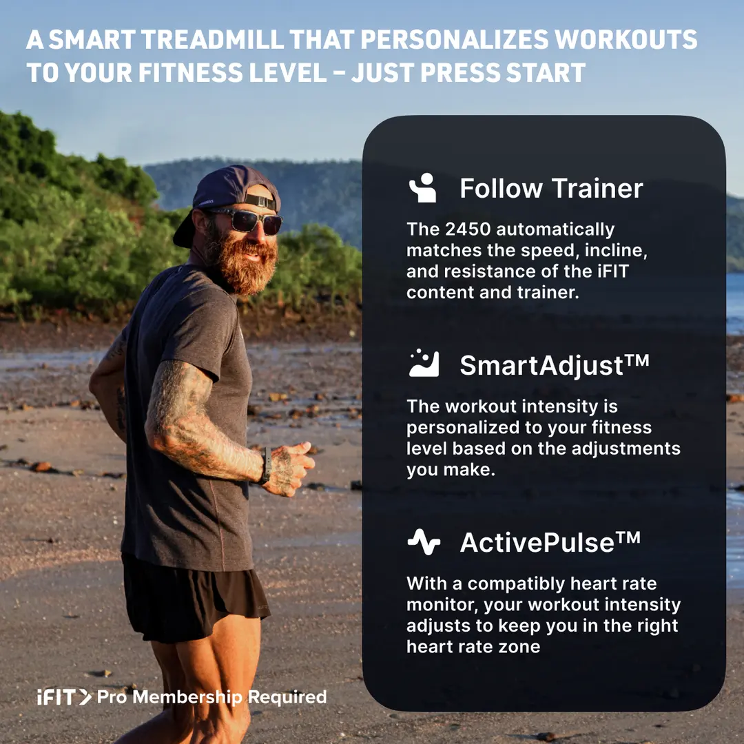 - iFIT-Erlebnis: globale Strecken, Coach-geführte Einheiten, automatische Anpassungen (Abo erforderlich)