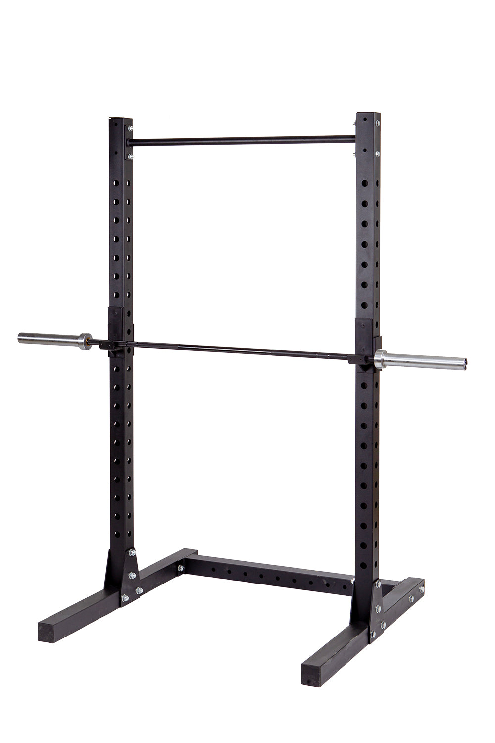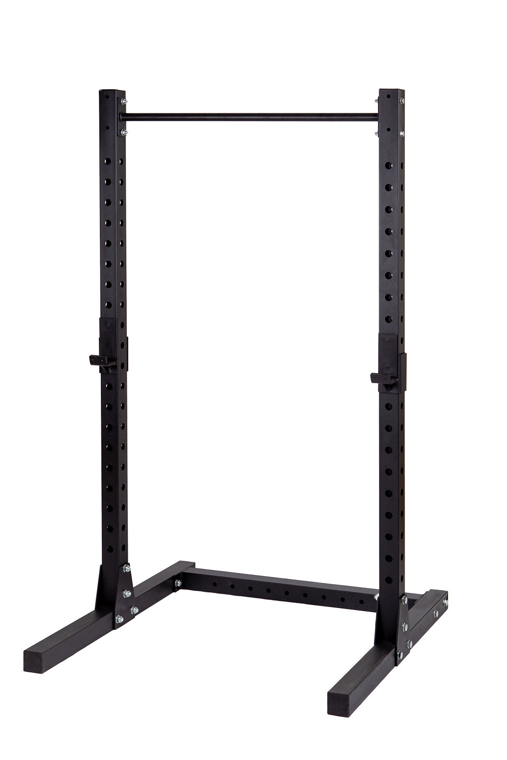 Kompaktes Half Rack mit integrierter Klimmzugstange, inkl. J-Hooks. Geeignet für Training mit Langhantel und Körpergewicht. Tragfähigkeit 500 kg. Robuste Stahlkonstruktion, Farbe Schwarz.